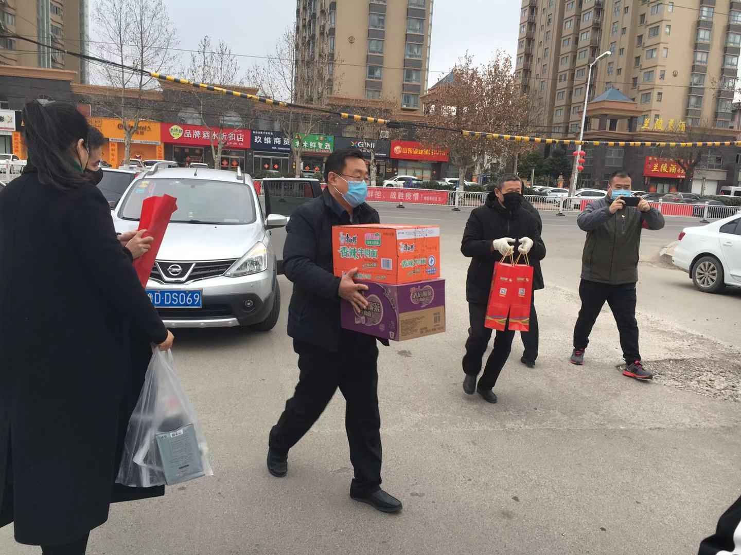 為社區(qū)居委會(huì)捐贈(zèng)口罩、消毒液等防疫物資及方便面等生活物資。